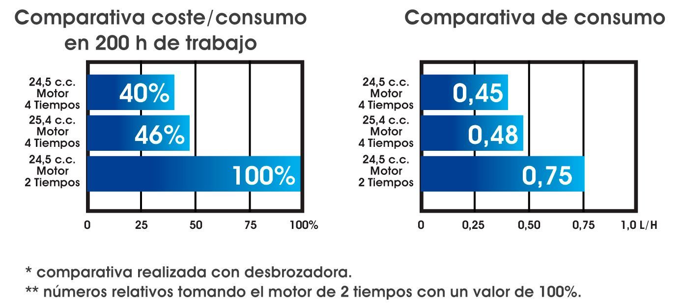 Después de realizar la prueba de comparación entre el motor de 24.5 c.c MM4 y un motor de 2 tiempos equivalente hemos llegado a la conclusión que el motor MM4 supera al motor de 2 tiempos tanto en consumo de combustible como en consumo de aceite, tal y como se muestra en el siguiente gráfico.